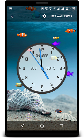 Wenn Sie die natürliche Schönheit unter Wasser lieben, werden Sie diese Analoguhr-Live-Wallpaper-App lieben. Es gibt viele coole Fisch-, Pflanzen- und Meeresblumenbilder zur Auswahl. Wenn Sie möchten, können Sie Ihren Namen oder was auch immer Sie möchten auf dem Bildschirm schreiben.